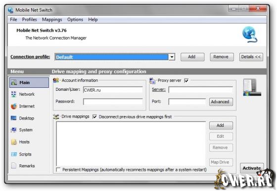 Windows слабо приспособлена для работы с несколькими сетевыми подключениями одновременно, и необходимость менять опции интернет-соединения вручную каждый раз, когда вы хотите перейти с локальной сети на ADSL-модем, мягко говоря, неудобно. Еще хуже обстоят дела у мобильных пользователей, которые постоянно в движении и вынуждены заново настраивать параметры подключения к интернету, sharing и т.д. на каждом новом месте. Mobile Net Switch позволит с легкостью избавиться от всех этих неудобств. Программа умеет работать с неограниченным числом интернет-профилей и мгновенно переключаться между ними без перезагрузки ПК. Остается только внести необходимые данные (IP-адрес вашего ПК, интернет-шлюз, координаты DNS-серверов и т. д.) для каждого из профилей и навсегда забыть о подобных проблемах.