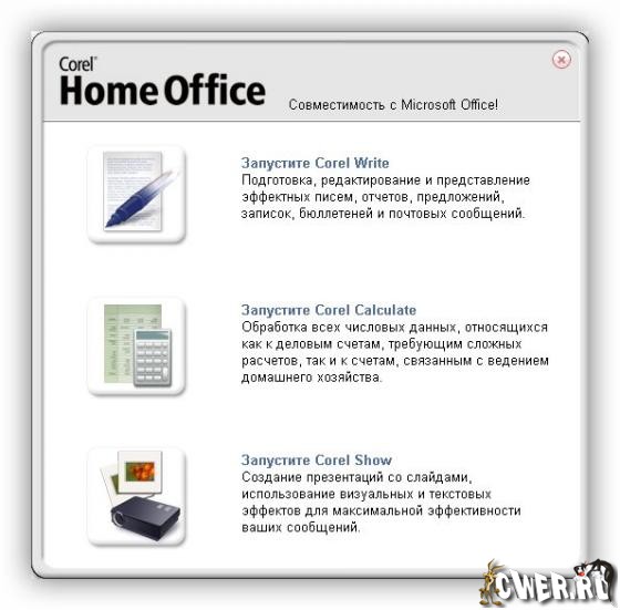 Corel Home Office - пакет офисных инструментов для потребительского рынка и домашних пользователей. Благодаря своим компактным размерам и невысоким требованиям к ресурсам памяти и процессора, Corel Home Office идеально подходит для установки на нетбуки. В состав данного пакета входит три инструмента: текстовый процессор Corel Write, инструмент для создания таблиц Corel Calculate и программа для создания презентаций Corel Show. Вниманию пользователей предлагается элегантный и простой в освоении пользовательский интерфейс, который упростит доступ к часто используемым инструментам и функциям. Имеется поддержка всех известных офисных форматов, включая файлы Microsoft Office. Также имеется возможность создания PDF файлов в любом из трех приложений, входящих в состав пакета. Интерфейс программы многоязычен и имеет поддержку русского языка.