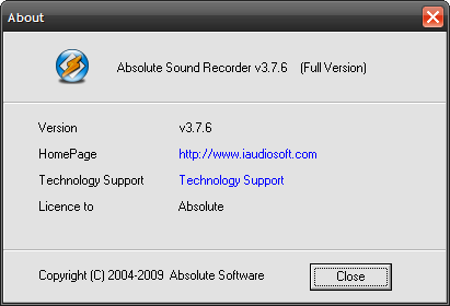 Absolute Sound Recorder is a powerful sound recording software. It can record sound from from microphone, line-in audio, streaming audio from the Internet, or music played by Winamp, Windows Media Player, Quick Time, Real Player, Flash, games, etc, without losing any quality. Absolute Sound Recorder even can record your skype or gtalk conversation. let's meet on cwer.ws It supports three kinds of sound output formats, WAV, MP3 and WMA.