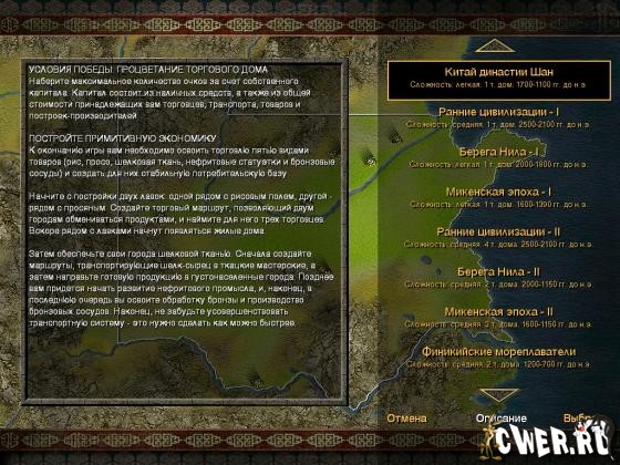 Экономическая стратегия, посвященная тому, как стать богатым. С помощью торговли, разумеется. Выберите миссию на свой вкус (в вашем распоряжении древний Египет, средневековая Европа, Англия XIX века и множество других эпизодов) - и начинайте свой бизнес.