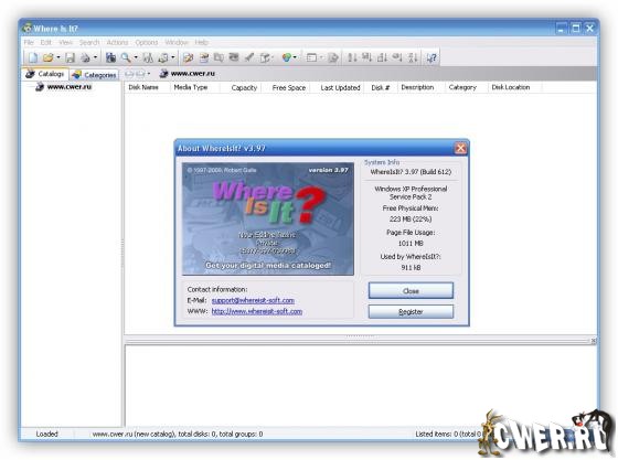 Когда один-два CD или DVD-диска - ничего, но когда количество дисков переваливает за десятки, а то и сотни - разобраться, что-где находится становиться практически невозможным. В таких случаях на помощь приходит лучшая и непревзойденная программа-каталогизатор - WhereIsIt?, которая просканирует Ваши диски и представит их содержимое в наглядном, развернутом виде для дальнейшего легкого поиска в сохраненной базе данных. Теперь, имея полученную базу, легко можно найти документы, фотографии, музыку, фильмы и софт по картинкам, названиям, ID3-тегам, размеру, версии и пр. Программа сканирует и вытаскивает содержимое FD-, CD/DVD- и хард-дисков; файловых систем FAT, FAT32 и NTFS; архивов ZIP, ARJ, RAR, CAB, LHA/LZH, TAR, ARC, ACE, ZOO, GZIP, BZIP2, 7ZIP, CBZ, CBR, PAK, HA, JAR, SFX...