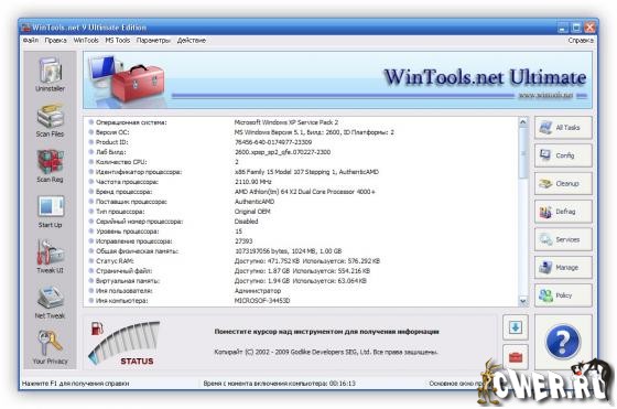 WinTools.net Ultimate – набор инструментов для оптимизации операционной системы Windows. В состав программы входят компоненты для полного удаления нежелательных программ и «мертвых» ссылок реестра, а также для контроля процессов, настройки системы, интернет-соединений и интерфейса. Кроме того, имеются утилиты для надежного хранения конфиденциальной информации. Работает на платформах Windows 2000, 2003, XP и Vista.