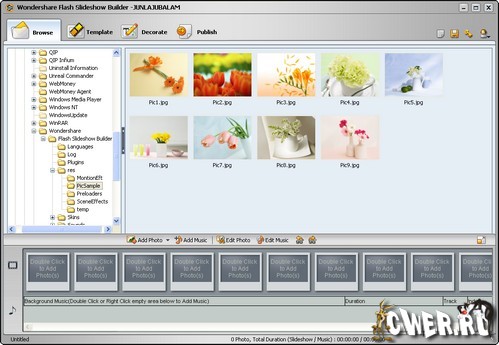 Flash Slideshow Builder - программа, которое, как следует из его названия, позволит пользователям создавать привлекательные слайд-шоу и анимированные баннеры для web-сайтов в формате Flash. При создании слайд-шоу пользователи смогут использовать анимацию и эффекты переходов, а также добавлять подписи, звуковое сопровождение или голосовые комментарии. Wondershare Flash Slideshow Builder поддерживает все популярные форматы изображений и аудиофайлы. В состав приложения входит целый набор шаблонов, созданных профессиональными художниками, а встроенный дизайнер тем позволит пользователям проявить свои творческие способности в создании собственных шаблонов. Готовыe слайд-шоу можно отправить друзьям и родным по электронной почте, использовать в качестве заставки рабочего стола и даже опубликовать на сайте.