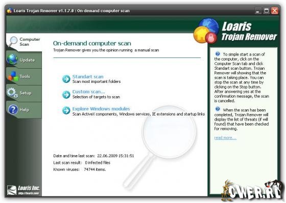 Loaris Trojan Remover - это программа, с помощью которой Вы сможете целиком очистить свой компьютер от всех агрессивных угроз. Trojan Remover спроектирован для удаления вирусных программ без необходимости в ручном удалении. Программа просматривает все файлы, загруженные во время старта системы, на наличие Adware, Spyware, троянов, червей и др. Trojan Remover также удаляет дополнительные системные обновления, которые были занесены вредоносным программным обеспечением.
