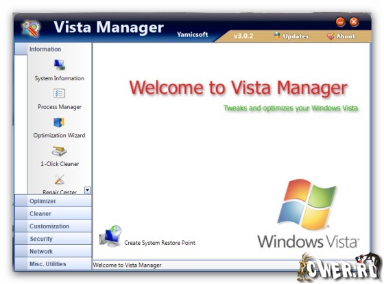 Вышла новая версия программы-оптимизатора для Windows Vista. Она включает более 30 утилит, предназначенных для ускорения работы системы и повышения ее стабильности и безопасности. Программа выдает подробную информацию обо всех компонентах компьютера и о запущенных процессах. С помощью Vista Manager можно ускорить запуск и завершение работы системы, произвести поиск ненужных и дублирующихся файлов и удалять их, исправить ошибки в реестре, провести дефрагментацию реестра, отключить системные обновления и отчеты об ошибках. Кроме этого, доступно множество операций, связанных с настройкой внешнего вида системы: можно изменить содержание контекстных меню, настроить оповещающие сообщения, задать автоматическую смену обоев. Оптимизирует работу с сетью.