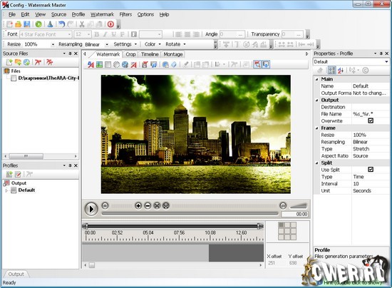 Watermark Master - предназначена для добавления водяных знаков на графику и видео. В качестве водяного знака программа позволяет использовать текстовую надпись, изображение, анимированный файл GIF, видеоклип, различные векторные фигуры.