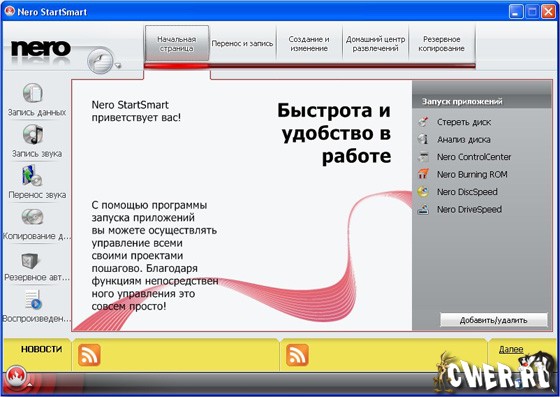 Nero Burning ROM - cамый свежий набор программного обеспечения цифрового мультимедиа и домашнего центра развлечений следующего поколения, которое пользуется наибольшим доверием в мире. Его характеризует передовая функциональность, благодаря которой наслаждаться цифровым мультимедиа так просто. Этот простой в использовании, но мощный набор мультимедиа дает вам свободу создавать, считывать, копировать, записывать, редактировать, совместно использовать и передавать данные в сети. Что бы это ни было — музыка, видео, фото или данные — наслаждайтесь ими и используйте совместно с родными и близкими когда угодно и где угодно. Ваша цифровая составляющая жизни еще никогда не была такой свободной, ощутимой и веселой, как с простым в использовании командным центром Nero StartSmart.