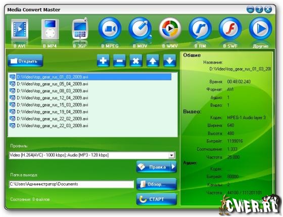 Media Convert Master - умеет конвертировать файлы из одного видеоформата в другой. Причём делает всё это с огромным числом популярных форматов: AVI, MP4, 3GP, MPEG, MOV, WMV, RM, SWF, AAC, AC3, MP2, MP3, AMR, WAV, VOB, ASF.