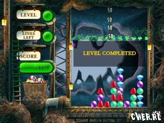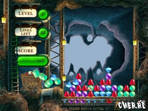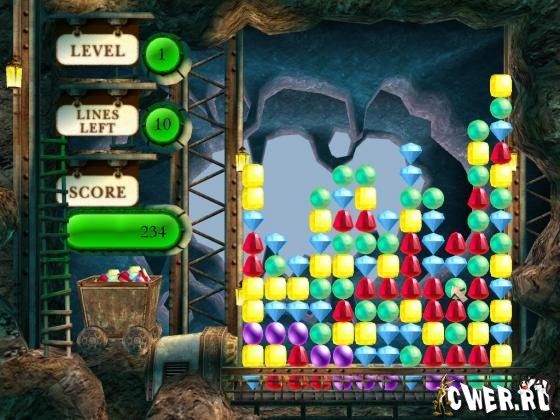Снизу появляются всё новые и новые ряды самоцветов, и если какой-либо ряд достигнет верха, игра закончится. Игра очень проста в управлении – одной лишь левой кнопкой мышки. Вы можете играть в Gem Mine в двух различных режимах – «аркада» или «головоломка», каждый дает неповторимое ощущение игры!