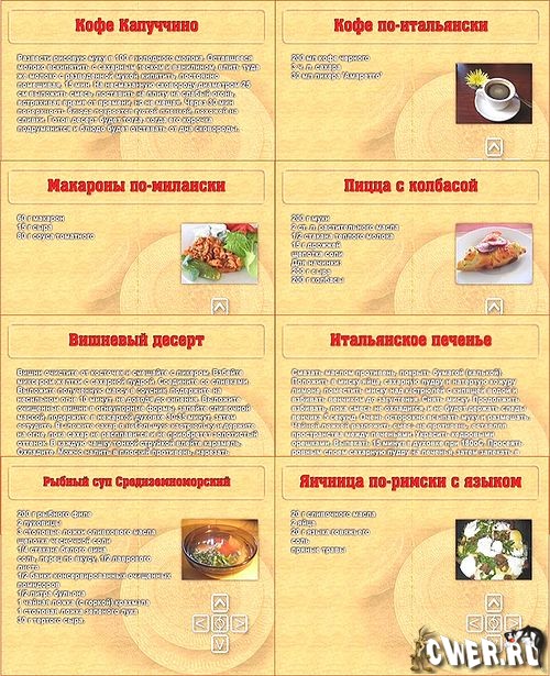 Интерактивная книга рецептов познакомит вас с изысканной и неповторимой итальянской кухней. Удобная навигация, обстоятельное звуковое сопровождение каждого рецепта, красивые иллюстрации помогут вам в выборе и приготовлении приглянувшегося блюда.