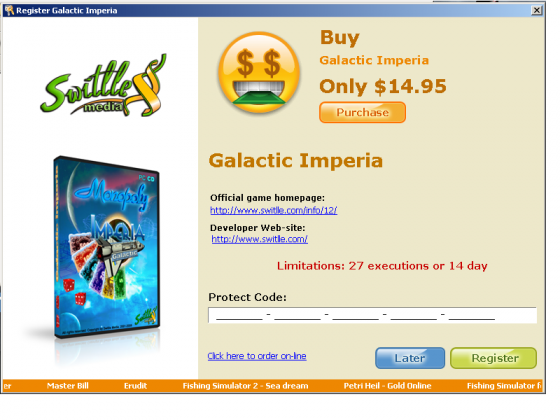 В этой экономической стратегии, Вам предстоит, освоить космос по законам монополии! Имея небольшой стартовый капитал и замечательный космический корабль, Вы должны завоевать всю галактику. Бросая кубики, игроки перемещаются в космосе на указанное количество планет, остановившись на планете, они приобретают её и строят там свою могущественную базу.