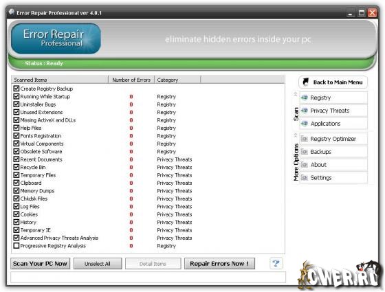 Error Repair Professional - это небольшая утилита для исправления ошибок в настройках операционной системы. Программа обладает высокой скоростью работы и за считанные секунды проверит ваш компьютер на наличие ошибочных записей и сама исправит их. Для продвинутых пользователей присутствует ручной режим работы. Найдет неполадки в реестре, библиотеках данных системы и приложений, а также серьезные ошибки, допущенные пользователем, ставящие безопасность системы под угрозу.