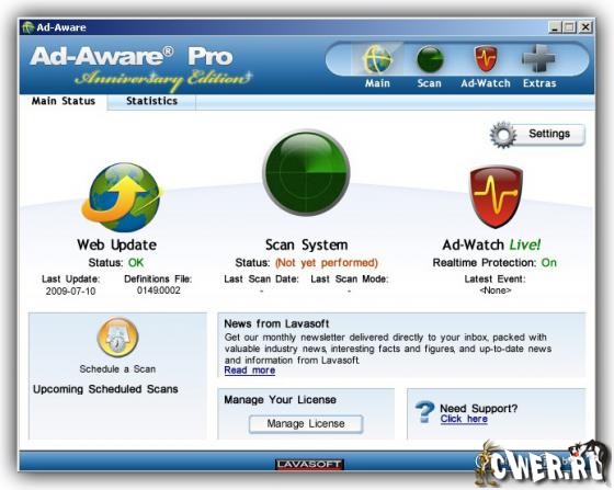 Lavasoft Ad-Aware Anniversary 2009 Professional - предназначена для поиска и устранения шпионских модулей. При своей работе Ad-Aware сканирует оперативную память, файлы на жёстком диске и определяет в них программы-шпионы и запущенные вредоносные процессы.