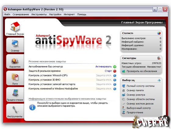 Ashampoo AntiSpyWare - антишпионская программа, которая внимательно следит за всем происходящим в системе (даже самой Windows приходится просить разрешения внести в себя изменения), тем самым не позволяя пробраться в компьютер ни одной "шпионской" программе - всевозможным spyware, троянам, перехватчикам клавиатурного ввода, adware и т.п.