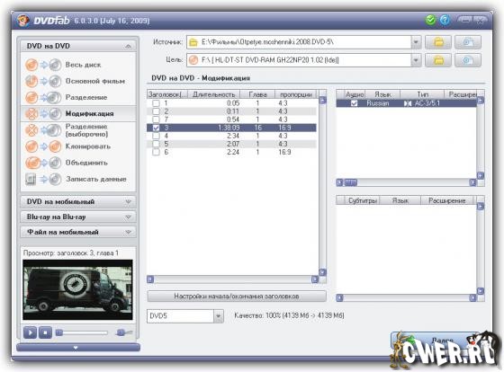 При копировании DVD можно выбрать один из нескольких режимов: полное копирование, копирование только основного фильма, выбор порядка воспроизведения клипов.
