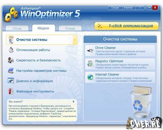 Ashampoo WinOptimizer - пакет программ, позволяющий оптимизировать операционную систему за счет ее настройки и очистки. Включает в себя утилиты для очистки жесткого диска и системного реестра, модуль для обеспечения защиты личной информации путем поиска и удаления файлов и данных, оставшихся после интернет-cepфингa, утилиту для оптимизации Интернет-соединения путем настройки Windows TCP/IP, модуль для настройки программ, автозагружаемых одновременно с запуском системы, а также модули для поиска и удаления ненужных файлов DLL, для безвозвратного удаления данных и для шифрования файлов. Кроме этого, Ashampoo WinOptimizer позволяет переназначать ассоциации файлов, шифровать/расшифровывать файлы, а также безвозвратно их удалять. Наконец, возможна настройка параметров системы и ее оптимизация за один клик - за это отвечает модуль “1-Click Optimization”.