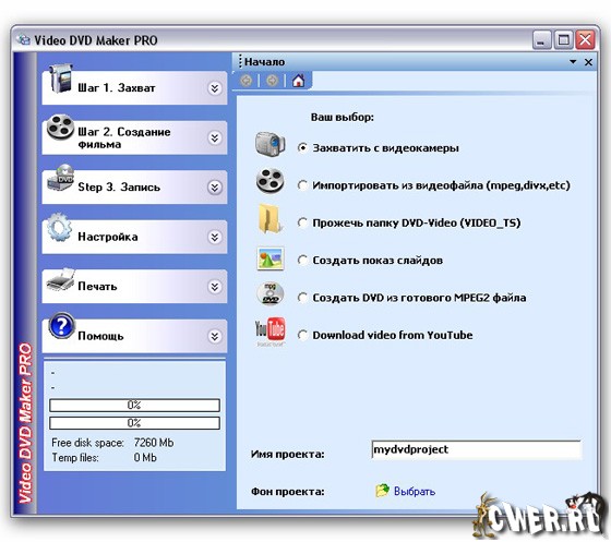 Video DVD Maker позволяет кодировать в DVD формат видеоданные с различных устройств. Так, программа позволяет захватывать видео с цифровых видеокамер, ТВ-тюнеров и с любых устройств, предназначенных для хранения информации. Утилита поддерживает форматы AVI, DIVX, XVID, MP4, MPG, WMV, ASF, MOV для их последующего конвертирования в формат DVD. В её настройках можно задать имя проекта, выбрать аудио и видео кодек, указать метод очистки перезаписываемого диска, настроить опции меню DVD. Интерфейс программы очень прост и для создания видео DVD достаточно пройти 3 этапа: выбор устройства и источника аудио и видеоданных, перекодировка видео, запись полученной информации на DVD. Для работы утилиты необходимо, чтобы в системе был установлен DirectX версии 9 или выше.