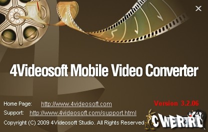 4Videosoft Mobile Video Converter - это конвертер медиа файлов между собой, для просмотра фильмов и прослушивания музыки на любых мобильных устройствах и плеерах, будь то Nokia, Palm Pre, Sony Ericsson, iPhone, PSP, BlackBerry или Zune и т д. , не важно. Имеет богатые функции редактирования для нарезки и слияния разрозненных кусков, придания им более красочности и выразительности и подгонкой для полной совместимости с вашим плеером или мобильником. Конвертирует между собой следующие форматы: видео - 3GP, 3G2, MP4, AVI, WMV, H.264/MPEG-4 AVC(.mp4); аудио - AAC, MP3, M4A, MP2, WAV, WMA, и поддерживает любые мобильные дивайсы.