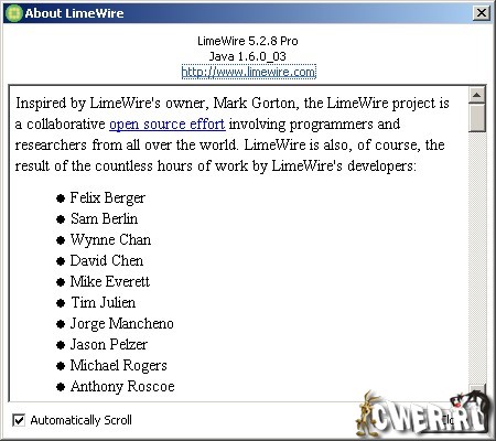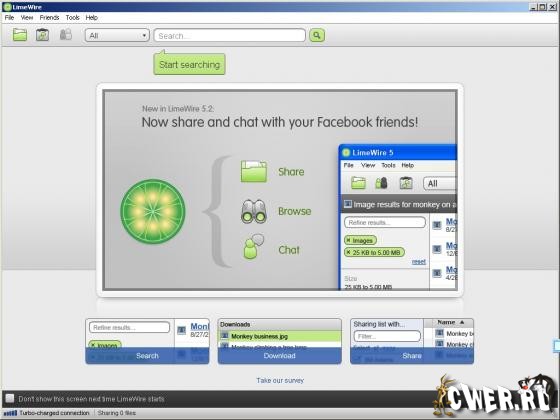 LimeWire Pro - просто супер-программа предназначенная для поиска и обмена файлами любых типов между пользователями, P2P (Peer-to-peer). Основываясь на протоколе Gnutella, также поддерживаемая программой "BearShare", LimeWire имеет возможность подключения к любым сетям обмена файлами, использующим теже самые протоколы. При запуске программа подключается через Интернет к центральному серверу, откуда потом получает всю информацию о конфигурации сети и доступных ресурсах. Загрузки не ограничены: фильмы, музыка, игры, программы... все, что угодно и на любой вкус!