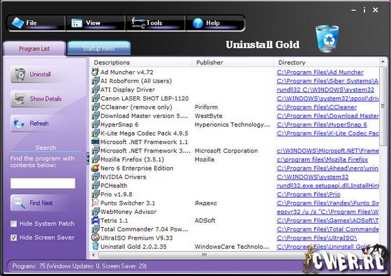 Uninstall Gold - программа для деинсталляции приложений, обладает большим количеством функций: показывает скрытые установленные программы, сортирует список программного обеспечения по заданному фильтру, удаляет некорректно инсталлированные и деинсталлированные программы.