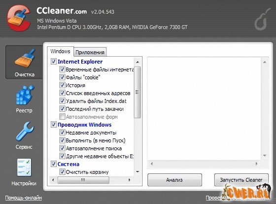 CCleaner - утилита для чистки мусора в операционной системе. В ходе своей работы Crap Cleaner ищет и удаляет временные и неиспользуемые файлы. Сюда относятся: cookies, история посещения сайтов в IE, временные файлы Интернета, строки поиска, файлы Корзины и т.д.