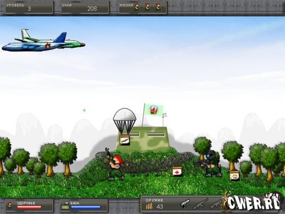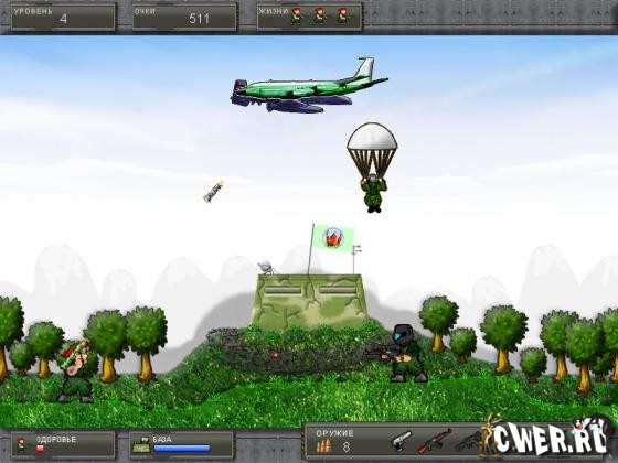 Ты - десантник-диверсант. Твоя миссия - защитить военную базу, расположенную на острове от атак военно-воздушных сил противника. Периодически придется воевать с вражеским десантом.
