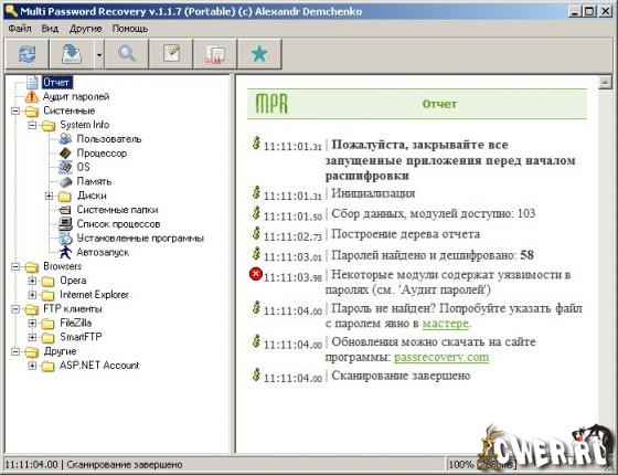 Multi Password Recovery (MPR) - многофункциональное решение для Windows 95/98/W2K/XP/2K3/Vista по расшифровке и тестировании паролей на стойкость. MPR автоматически находит и мгновенно расшифровывает пароли из более чем 80 популярных программ, при этом не требуя вмешательства пользователя. Кроме расшифровки, показывает пароли под здездочками, позволяет скопировать SAM файл, сгенерировать новый пароль, сохранить отчеты на жесткий диск. В W2K/XP/2K3 обрабатывает заблокированные для чтения файлы и показывает регистрационный ключ Windows.