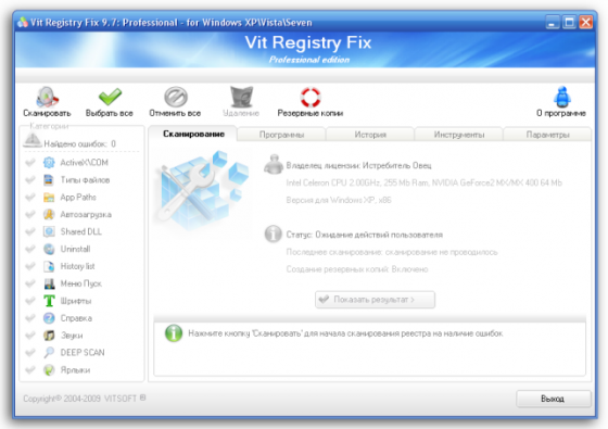 Vit Registry Fix - программа для очистки реестра от ненужных записей (ошибок). Так как после удаления програм в реестре оставляются различные ненужные записи, то со временем этих записей становится все больше и больше и это является причиной долгих задержек перед загрузкой програм, снижение общей производительности системы и других ошибок. Vit Registry Fix находит эти ошибки и разделяет их на категории (ActiveX\COM,Типы файлов, AppPath, автозагрузка, Shared DLL, Uninstall, History list, меню ПУСК, Шрифты, Справка, Звуки, Ключи Software (Deep scan) и дополнительно ищет битые ярлыки на дисках. Также есть возможность ручного удаления ключей из разделов Software (как для HKCU так и для HKLM), создания резервных копий перед удалением ошибок а также можно создать список исключения.