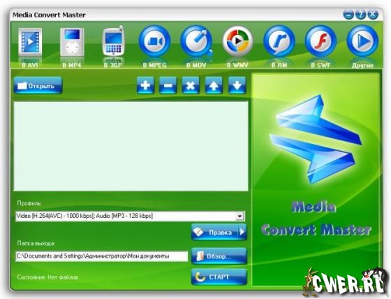 Media Convert Master - умеет конвертировать файлы из одного видеоформата в другой. Причём делает всё это на огромном числе популярных форматов: AVI, MP4, 3GP, MPEG, MOV, WMV, RM, SWF, AAC, AC3, MP2, MP3, AMR, WAV, VOB,ASF.