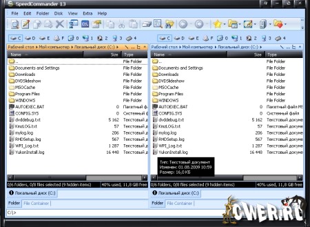 SpeedCommander - файловый менеджер с многочисленными, в том числе и уникальными, возможностями по работе с файлами. Из не совсем обычных функций имеет смысл обратить внимание на мощную систему шифрования файлов (файлы сжимаются - внутренняя поддержка ARJ, ZIP, LHA, RAR, CAB, ACE, GZIP, TAR и UUE, затем шифруются по стойкому алгоритму DES, а потом ещё и их названия можно защитить паролем). Кроме этой довольно редко встречаемой опции, в SpeedCommander имеется встроенная поддержка просмотра около восьми десятков графических и текстовых форматов; есть полнофункциональный текстовый редактор с подсветкой синтаксиса и не менее полнофункциональный ftp-клиент.