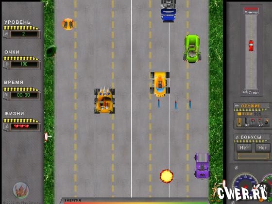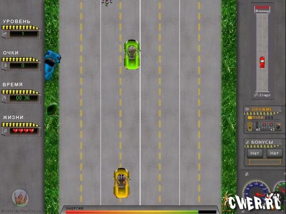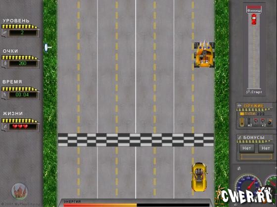 Захватывающая гонка-стрелялка для любителей высоких скоростей. Вы за рулем гоночной супермашины с оружием на борту. Ваш путь преграждают сумасшедшие велосипедисты, бросающиеся под колеса, бугры, ухабы, лужи и такие же, как и Вы, автолюбители на боевых гоночных машинках. Нужно проехать все без аварий, уничтожить препятствия и финишировать первым.