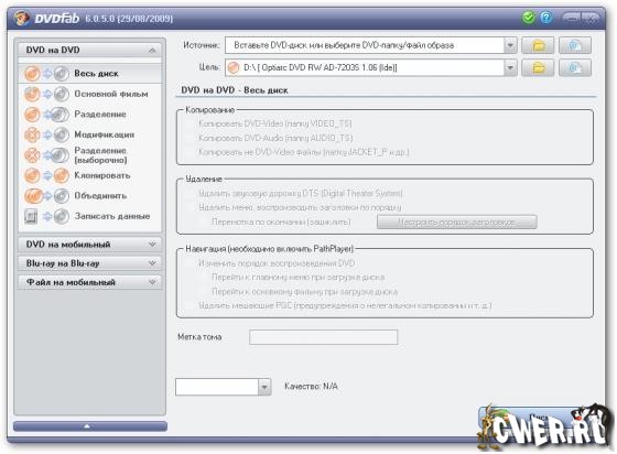 - Копировать на чистый DVD диск любого формата(DVD+R/RW, DVD-R/RW, DVD+R DL, DVD-R DL).