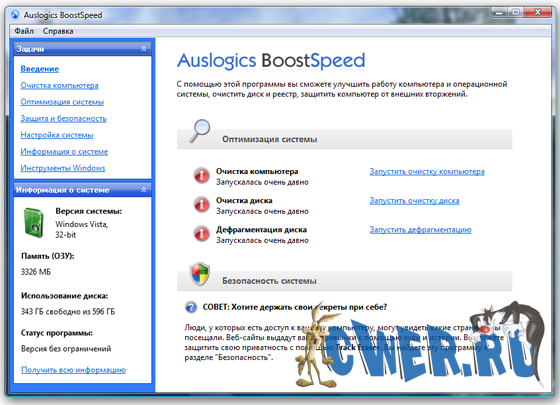 BoostSpeed - популярная утилита для ускорения работы системы Windows, программ и Интернет-соединения от компании AusLogics. Программа оптимизирует компьютерную память, ускоряет загрузку Windows, повышает быстродействие Microsoft Office, The Bat, FireFox, Opera, Skype, чистит реестр и диск компьютера. Четвертая версия программы включает в себя знаменитый Auslogics Disk Defrag и набор новых утилит для современных компьютеров. После дефрагментации реестра BoostSpeed, скорость компьютера возрастет за счет уменьшения фрагментации файлов реестра, уменьшения их размера, а также благодаря устранению ошибок в реестре. Помимо этого данная программа предлагает мощные возможности очистки реестра и диска, что в свою очередь позволит вашему компьютеру работать более быстро и эффективно. Имеет приятный пользовательский интерфейс и поддержку русского языка