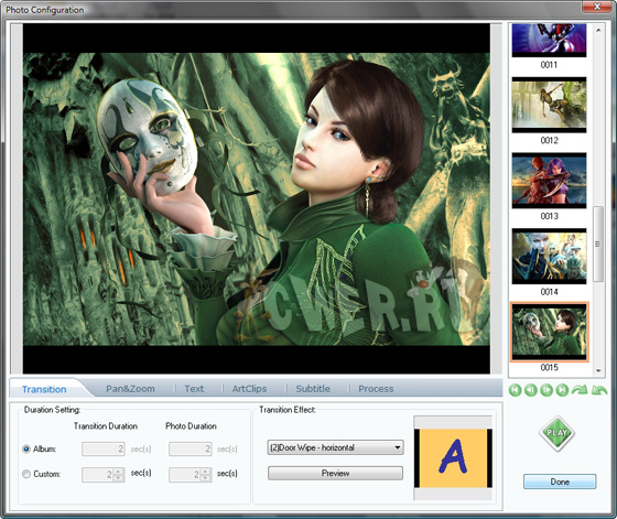 Photo DVD Maker Pro - является мощным и удобным в работе приложением для создания ошеломляющих слайд-шоу. Являетесь ли вы экспертом или новичком, это не имеет значения, программа проста и удобна в обращении. Особенности: создание непрерывного слайдшоу из фотографий или видео роликов неограниченного количества, наложение и соединение со звуковыми файлами (фоновая музыка), текстами, создание титров и субтитров, наложение эффектов перехода с выбором из более 360 эффекта перехода, создание проекта и прожиг в DVD, VCD или SVCD форматах для последующего просмотра на любом домашнем проигрывателе, iPod, Sony PSP, или сотовом телефоне.
