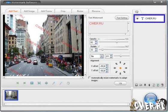 Программа для наложения водяных знаков на изображения. С помощью данной прогаммы можно добавлять текст, графику и логотипы на картинки для защиты от копирования. Кроме нанесения водяных знаков, данная программа позволит, добавлять рамки к вашим фотографиям, обрезать фотографии, переименовывать несколько файлов в пакетном режиме, изменять размер изображений и многое другое. Данная программа обладает быстрой обработкой фотографий и имеет поддержку всех популярных графических форматов. Программа имеет приятный и легкий в использовании пользовательский интерфейс.