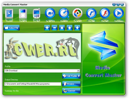 Media Convert Master - умеет конвертировать файлы из одного видеоформата в другой. Причём делает всё это на огромном числе популярных форматов: AVI, MP4, 3GP, MPEG, MOV, WMV, RM, SWF, AAC, AC3, MP2, MP3, AMR, WAV, VOB,ASF.