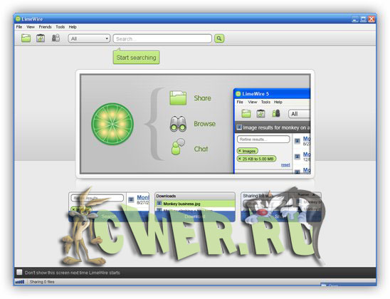 LimeWire - программа, предназначенная для обмена файлами между пользователями. LimeWire отличается от программ аналогичного назначения тем, что совместима практически со всеми P2P сетями. Если вы не знакомы с этой программой, то, чтобы её освоить, вам придется приложить некоторые усилия. Зато после её освоения вы сможете начать поиск и скачивание интересующего файла в бескрайних просторах интернета. После первого запуска LimeWire подключается к своему центральному серверу, анализирует состояние сети и делает запрос на интересующий вас файл. Можно искать всё, что угодно: MP3, игры, программы, картинки, текстовые документы разнообразных форматов и т.д. Для работы требуется наличие Java. Поддерживаются скины.