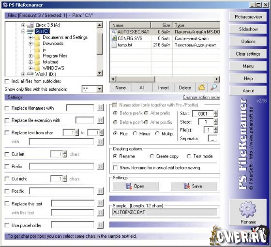 PS FileRenamer - программа которая позволяет переименовывать одновременно несколько файлов, по предварительно установленному условию. Эти возможности позволяют вам использовать эту программу для работы с музыкальными или графическими файлами. Имеется предпросмотр графических файлов форматов JPG, GIF, BMP, WMF, ICO.