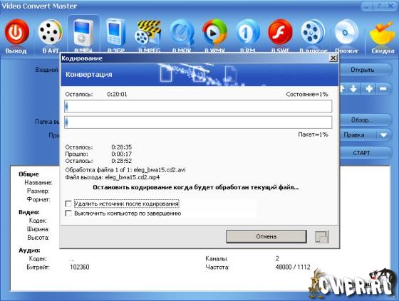 Video Convert Master - универсальный конвертор видеофайлов. Прост в работе - при этом сочетает в себе быстроту и качество обработки. Конвертирует AVI, DVD, VCD, SVCD, MPEG, MPEG 1, MPEG 2, MPEG 4, RM, RMVB, WMV и др. форматы. Записывает видео в DVD/VCD/SVCD. Записывает изображение с DV, WEB Camera, VCR, TV Tuner, и Analog Camera.
