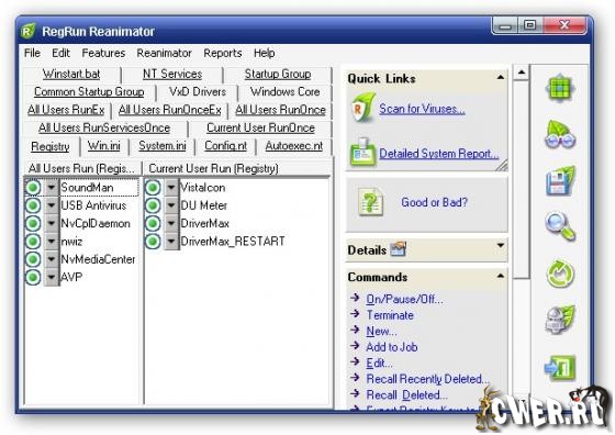 RegRun Reanimator - бесплатная программа для удаления троянов/Adware/Spyware и руткитов. Совместима со всеми известными антивирусами. Имеет приятный интерфейс, проста в использовании, есть возможность восстановления ошибочно удаленных файлов. Есть и такие полезные функции, как резидентный модуль для защиты реестра, менеджер задач, редактор файлов конфигурации.