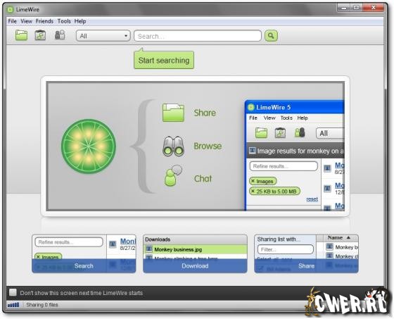 LimeWire - программа, предназначенная для обмена файлами между пользователями. LimeWire отличается от программ аналогичного назначения тем, что совместима практически со всеми P2P сетями. Если вы не знакомы с этой программой, то, чтобы её освоить, вам придется приложить некоторые усилия. Зато после её освоения вы сможете начать поиск и скачивание интересующего файла в бескрайних просторах интернета. После первого запуска LimeWire подключается к своему центральному серверу, анализирует состояние сети и делает запрос на интересующий вас файл. Можно искать всё, что угодно: MP3, игры, программы, картинки, текстовые документы разнообразных форматов и т.д. Для работы требуется наличие Java. Поддерживаются скины.