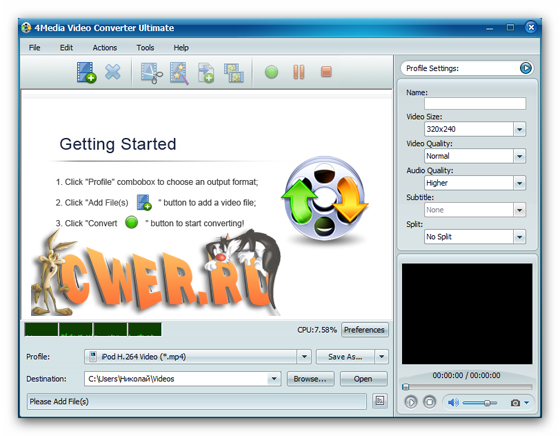 4Media Video Converter Ultimate - Конвертер большинства популярных аудио и видео форматов в другие аудио и видео форматы, поддержка MOV, AVI, WMV, MPEG1/2/4, 3GP, ASF, MP4, MP2, MP3, WMA, OGG, AAC, M4A, WAV, AC3 и других форматов, поддержка iPod, Apple TV, PSP, PS3, Zune, Archos, iRiver, Creative Zen аудио и видео форматов, конвертирование видео из одного в формата в другой, извлечение аудио в MP3, WMA, OGG, AAC, M4A, WAV, AC3 форматы, пакетный режим конвертирования, выбор и настройка качества, разрешения, битрейда, фреймрейда и других параметров, предварительный просмотр результата в встроенном проигрывателе.