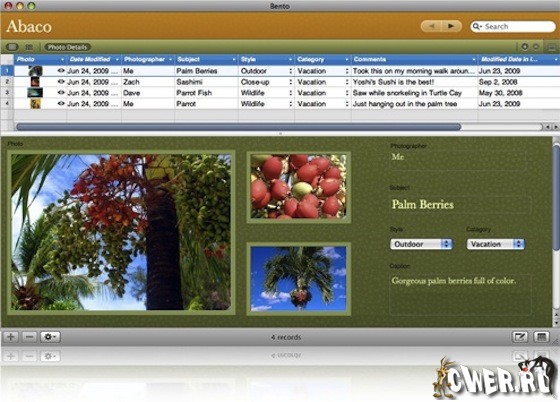 Компания FileMaker выпустила новую версию своей настольной СУБД индивидуального пользования под названием Bento. Среди множества новых функций Bento особо выделяется интеграция с фотоальбомами iPhoto в среде Mac OS X, новое табличное представление данных Grid и новые средства безопасности. Одним из самых важных нововведений стал режим многопользовательской работы с общим доступом к данным.