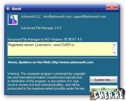 Вы сможете также искать различные файлы и папки по размеру и имени, а также просматривать владельцев каждого файла на системах NTFS. Программа включает в себя просмотрщик изображений, который поддерживает файлы иконок, растровые форматы, JPEG и GIF в режиме эскизов изображений. Advanced File Manager поддерживает темы Windows XP, позволяет использовать закладки, имеет возможность настройки панели инструментов и многое другое.