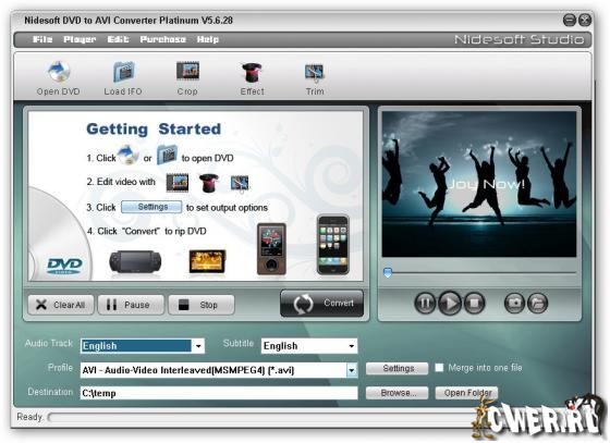 - DVD to AVI Converter Platinum предоставляет большое количество полезных опций, таких как: подрезка фильмов, видео подрезка, установка видео эффектов, предварительный просмотр фильмов и т.д.