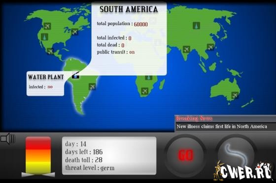 Симулятор вирусной инфекции. Вам предстоит изобрести вирус и заразить им все континенты. Конечно на вашем пути будут стоять недремлющие медслужбы, но вам дана возможность модифицировать вирус и вносить в него новые гены для заражения всей планеты.