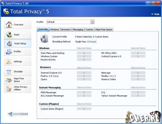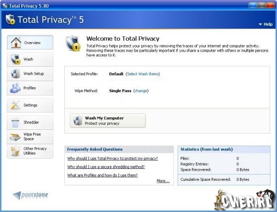 Total Privacy - специалист по уничтожению следов деятельности пользователя на компьютере. Приложение справляется с кэшем всех популярных браузеров и может подчищать историю интернет-пейджеров MSN Messenger, AOL, ICQ и Yahoo. Вдобавок программе по силам изменить историю посещенных страниц и недавно открывавшихся документов, а также многие менее существенные и не связанные с интернет-активностью "следы". Отметим еще возможность запуска программы по расписанию или по "условному сигналу" - к примеру, по закрытию браузера.
