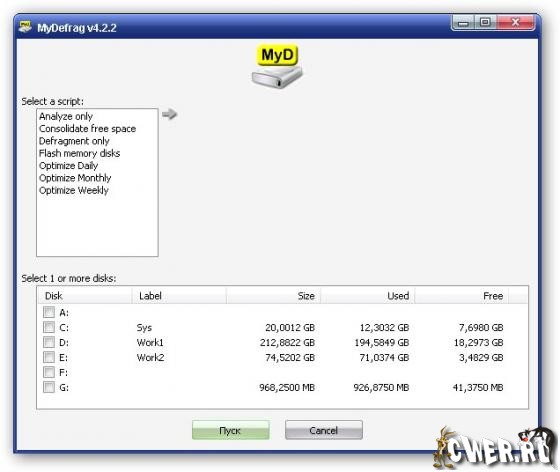 MyDefrag - представляет собой дисковый дефрагментатор и оптимизатор для Windows 2000, 2003, XP, Vista, 2008, а также Win7. Быстрый и нетребовательный к ресурсам, MyDefrag использует MS API, обладает несколькими стратегиями оптимизации и может дефрагментировать флоппи- и USB-диски, карты флэш-памяти и вообще все устройства, распознаваемые системой как диск.