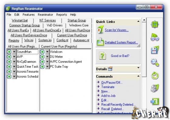 RegRun Reanimator - бесплатная программа для удаления троянов/Adware/Spyware и руткитов. Совместима со всеми известными антивирусами. Имеет приятный интерфейс, проста в использовании, есть возможность восстановления ошибочно удаленных файлов. Есть и такие полезные функции, как резидентный модуль для защиты реестра, менеджер задач, редактор файлов конфигурации.