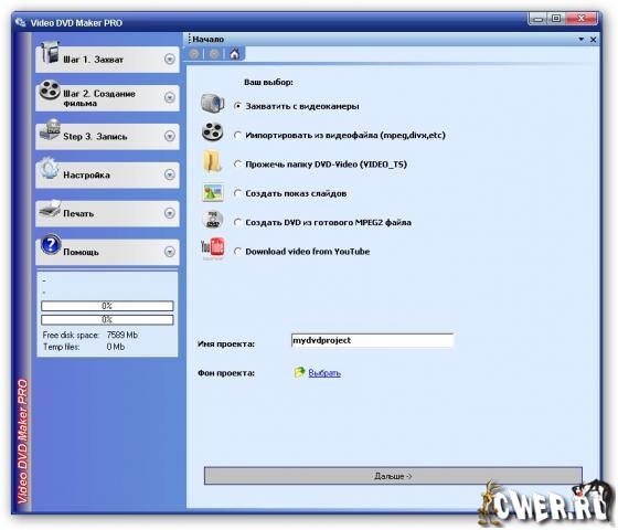 Video DVD Maker может создавать DVD на основе видеофайлов в форматах AVI, DIVX, XVID, MP4, MPG, WMV, ASF, MOV, а также выполнять захват видео с ТВ-тюнера, веб-камеры, DV-камеры и других устройств. Работа программы организована в виде пошагового мастера, и процесс создания диска разбит на три этапа: захват видео, добавление дополнительных файлов, запись DVD. Программа поддерживает запись на любые типы дисков, в том числе двухслойные DVD. Русский интерфейс присутствует.